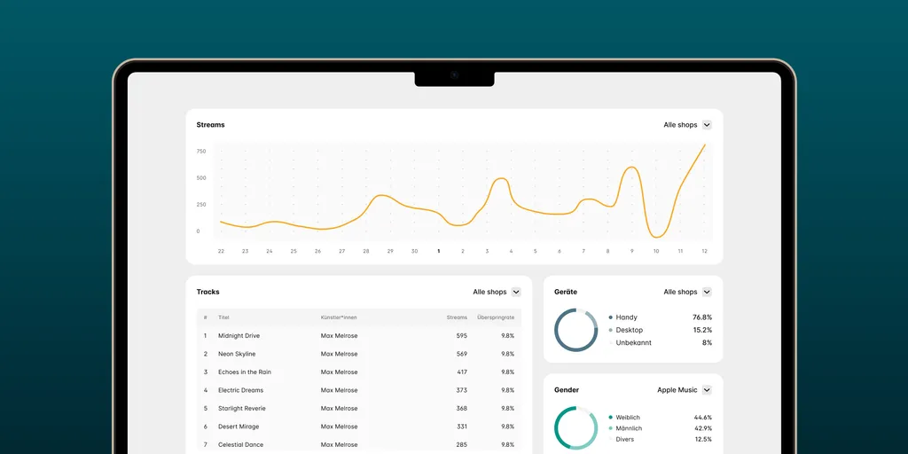 Erhalte detaillierte Einblicke von allen wichtigen Streaming- und Download-Plattformen. Analysiere die Performance deiner Musik und erweitere deine Fanbase mit dem nötigen Know-how.