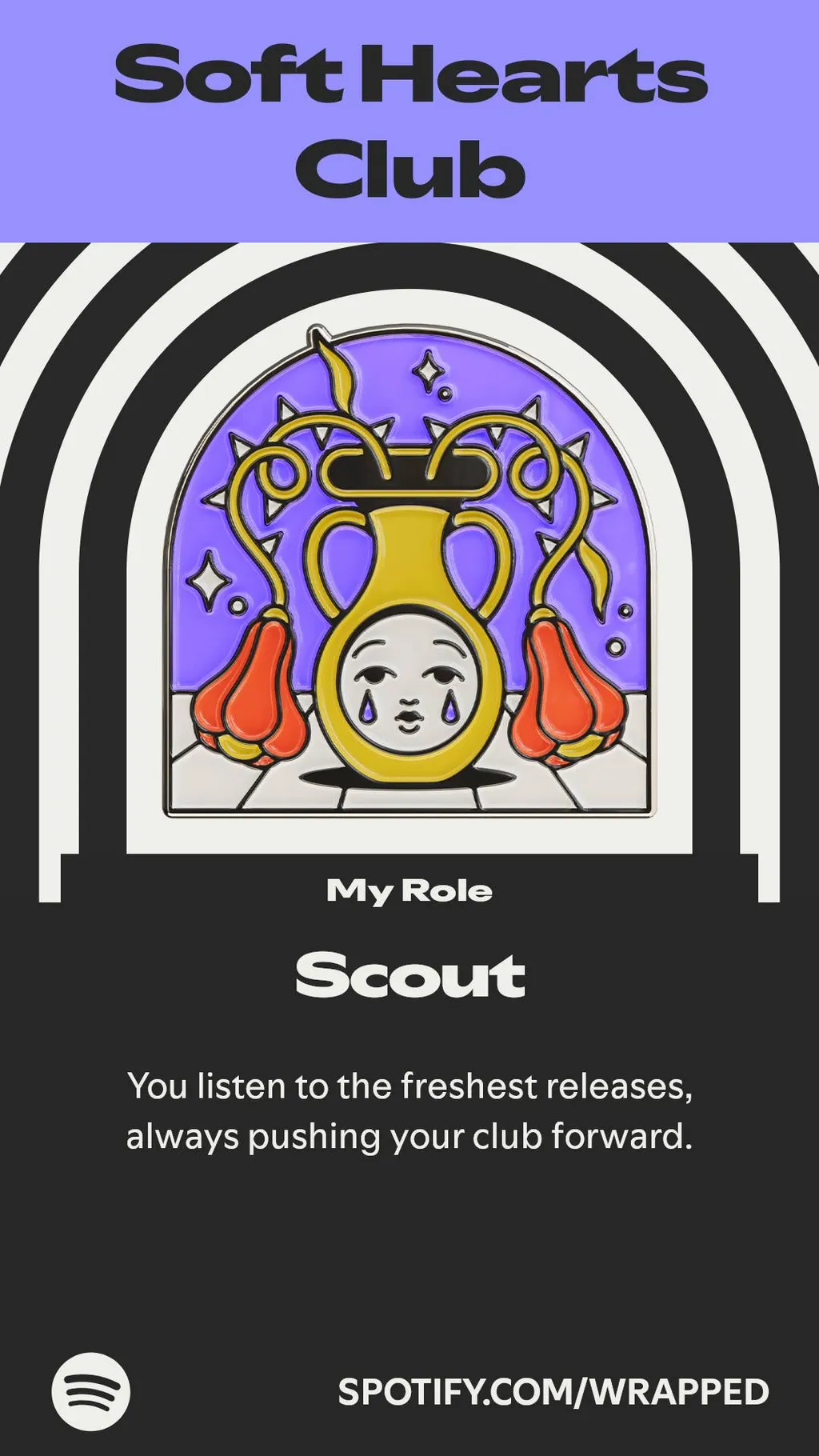 A second new category is called Clubs and should represent the emotional qualities and characteristics of the music one listened to most, including mood, genres, and other musical attributes. Each track you stream is tagged with descriptors based on the user playlist titles it appears in. These descriptors feed into six possible Clubs, with listeners assigned to the one with their highest stream score. Additionally, within each club, users receive a role that reflects their listening behavior and performance relative to the rest of the Club. For instance, you might be a Scout, mainly seeking out new releases, or a Specialist, defined by exploring more experimental sounds.